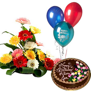 3 Balloons+ Chocolate Cake + Mix Gerberas Basket3 Balloons+ Chocolate Cake + Mix Gerberas Basket |