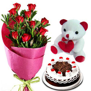 A Gift 2 youOne dozen red roses bunch type bouquet w/ 8 inches teddy bear w/ pillow and choco mocha cake. A nice gift when you fall in love with someone but don't know what to offer her. |
