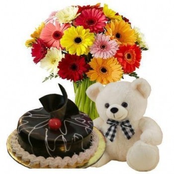 A Roaring B'day WishCroon up a birthday song for your friend/ loved one with this gift.(20 mix gerbera bunch with chocolate cake & 8 inches small teddy ). |