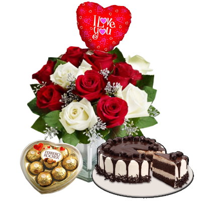 Birthday GIFts 124 White & Red Roses In FREE Vase, Cake with Ferrero Heart Shape Chocolate & Balloon |