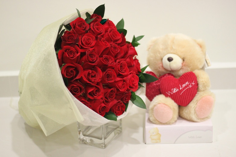 Bear & Flower24 red roses bunch & 9 inches bear with love pillow. perfect gift to celebrate your love |