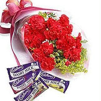 Bouquet carnation With Cadbury10 Carnations Bouquet With Cadbury Chocolates (4*65 grm). |