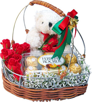 Celebrate the dayBasket of 12 Red Roses and 16 Pcs Ferrero Rochers Chocolate Box with 6 Inches Teddy Bear. |
