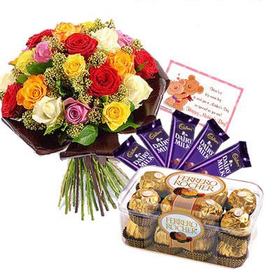 Choco DelightChoco Delight - 24 Mix Roses in Bunch, Ferrero Rocher 16 pcs, 5 Dairy Milk 65 gms each and Card valentine day card |