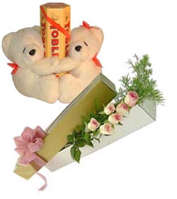 Deeply in loveCouple bear with 6 pink roses and 6 * 50 grm toblerone chocolates. |
