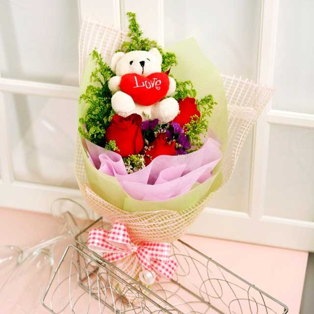 THE 3-WORD SENTENCE3 Stalks Red Roses With Small Bear and pillow |