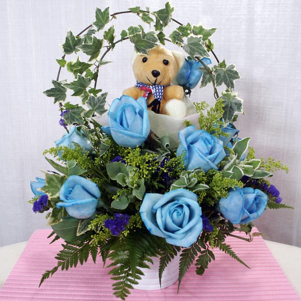 Blue Roses with a Bear12 Blue Roses Table Arrangement teddy bear is for design only.(not included). |