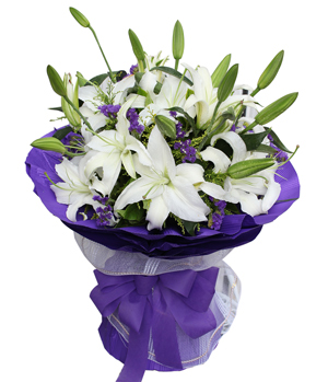 9 White Lily BouquetExquisite white lilies bouquet: 9 perfume white lilies with forget-me-not, solidago, gypsophila decorated; Purple color crepe paper round hand bouquet. |