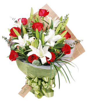 Donn ToutRed roses 9 stems, white lilies 3 stems, match green. English news paper and with gauze packed, finished with bowknot. |