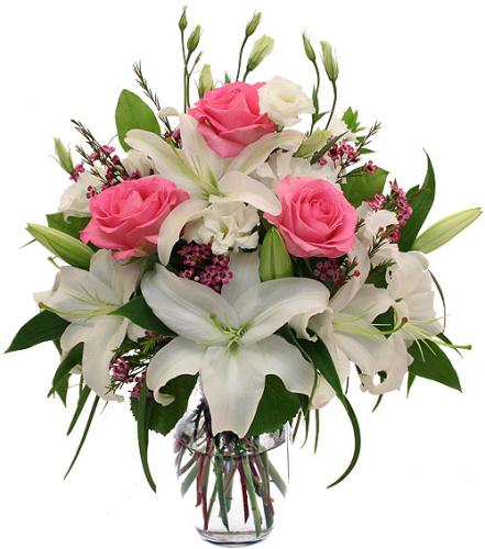 Nothing tells your loved ones how much you love them than this gorgeous sophisticated flower bouquet. Pink roses and white lilies are delicately hand arranged with other flowers of the finest quality.