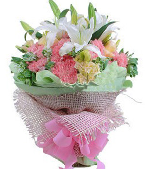More Blissful2 White lilies, 19 pink carnations with grean leaves. Light blue paper and pink gauze wrapped, pink ribbon. |