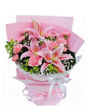 Pink Flower Love3 pink lilies, 12 pink carntions with baby's breath ornament, pink crepe paper packing. |