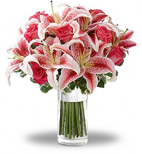 SIMPLE ELEGANCEBoth simple and elegant, this bouquet includes the classical pink roses and stargazer combination, which never fails to bring joy to the receiver. |