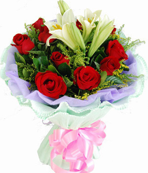 11 premium red roses, 1 stalk easter lily and match foliages and small flowers. Lilac colour cotton paper and green crepe paper round packed.