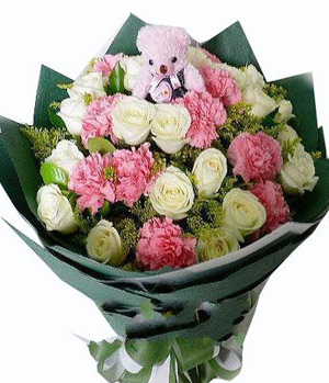 white roses+pink carnations11 white roses, 12 pink carnations, green leaves, a small teddy bear sit on bouquet, available for Great love, as wells as for mother annd elder women |