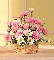 Basket arrangement with 12 pink roses, pink mini carnations, and hot pink carnations is complemented by some white seasonal flower. Designed in a handled basket.