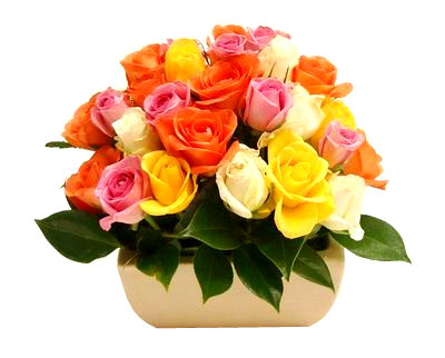 2 dozen multicolored roses in a basket.