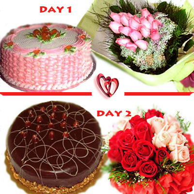 Send fresh roses to your sweet valentine & express everything what you want to say. Hamper includes two days package: Day 1-feb 13 : 12 pink roses bunch with 1/2 Kg mocha cake cake design may vary DAY-2 feb14: 12 red & pink roses bunch along with 1/2 Kg chocolate cake. cake design may vary-